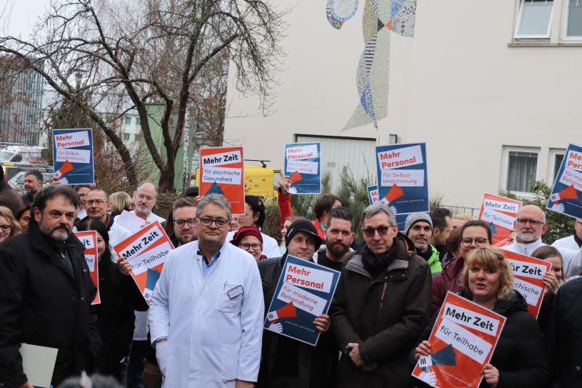 Zahlreiche Mitarbeiterinnen und Mitarbeiter, quer durch alle Berufsgruppen, protestierten am Bezirkskrankenhaus Bayreuth gegen die neue Personalbemessungsrichtlinie in Psychiatrie und Psychosomatik. Wenn diese in Kraft tritt, so die Befürchtung, führe das erneut zu einer Benachteiligung psychisch Kranker. Foto: Andrea Franz