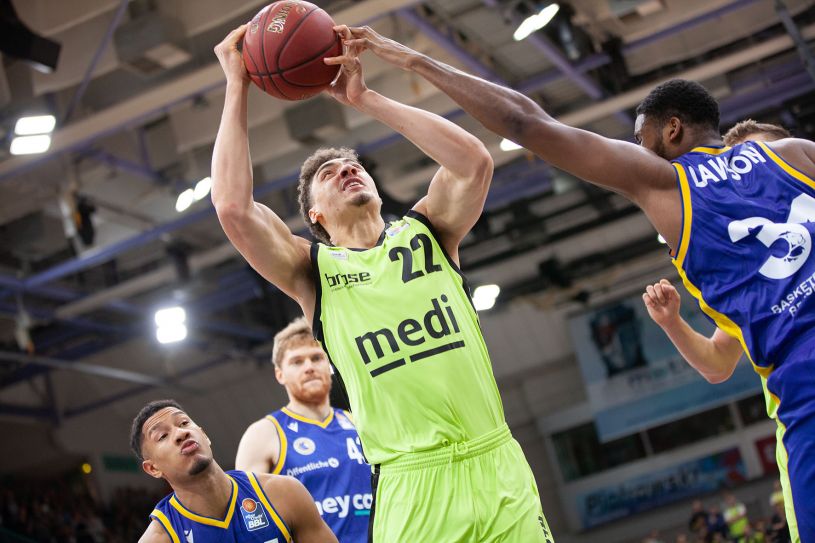 In der aktuellen Saison gab es zahlreiche Neuzugänge, wie Reid Travis. Ihn holte Coach Raoul Korner aus der Summer League als neuen Center in das Team. 2020 steht die Neuformung und Stärkung des Teams im Fokus (hier beim Spiel gegen Brose Bamberg). (© www.medi.de)