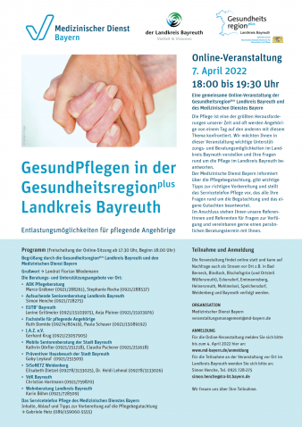 Die Pflege ist eine der größten Herausforderungen unserer Zeit und oft werden Angehörige von einem Tag auf den anderen mit diesem Thema konfrontiert. Wir möchten Ihnen in dieser Veranstaltung wichtige Unterstützungs- und Beratungsmöglichkeiten in Stadt und Landkreis Bayreuth vorstellen und Ihre Fragen rund um die Pflege im Raum Bayreuth beantworten. Der Medizinische Dienst Bayern informiert über die Pflegebegutachtung, gibt wichtige Tipps zur richtigen Vorbereitung und stellt das Servicetelefon Pflege vor, das alle Ihre Fragen rund um die Begutachtung und das eigene Gutachten beantwortet. Im Anschluss stehen Ihnen unsere Referentinnen und Referenten für Fragen zur Verfügung und vereinbaren gerne einen persönlichen Beratungstermin mit Ihnen.